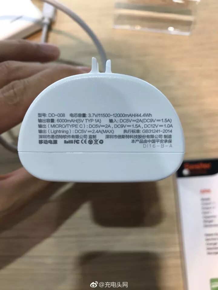 沃品展出系列充电宝,无线充电座,苹果背夹电池,其中5000mAh充电宝特别抢眼:体积小巧,支持Microusb、USB-C双输入,USB输出支持5V/2.4A。背夹电池为了方便插拔,在Lightning 端头做了特别设计。
